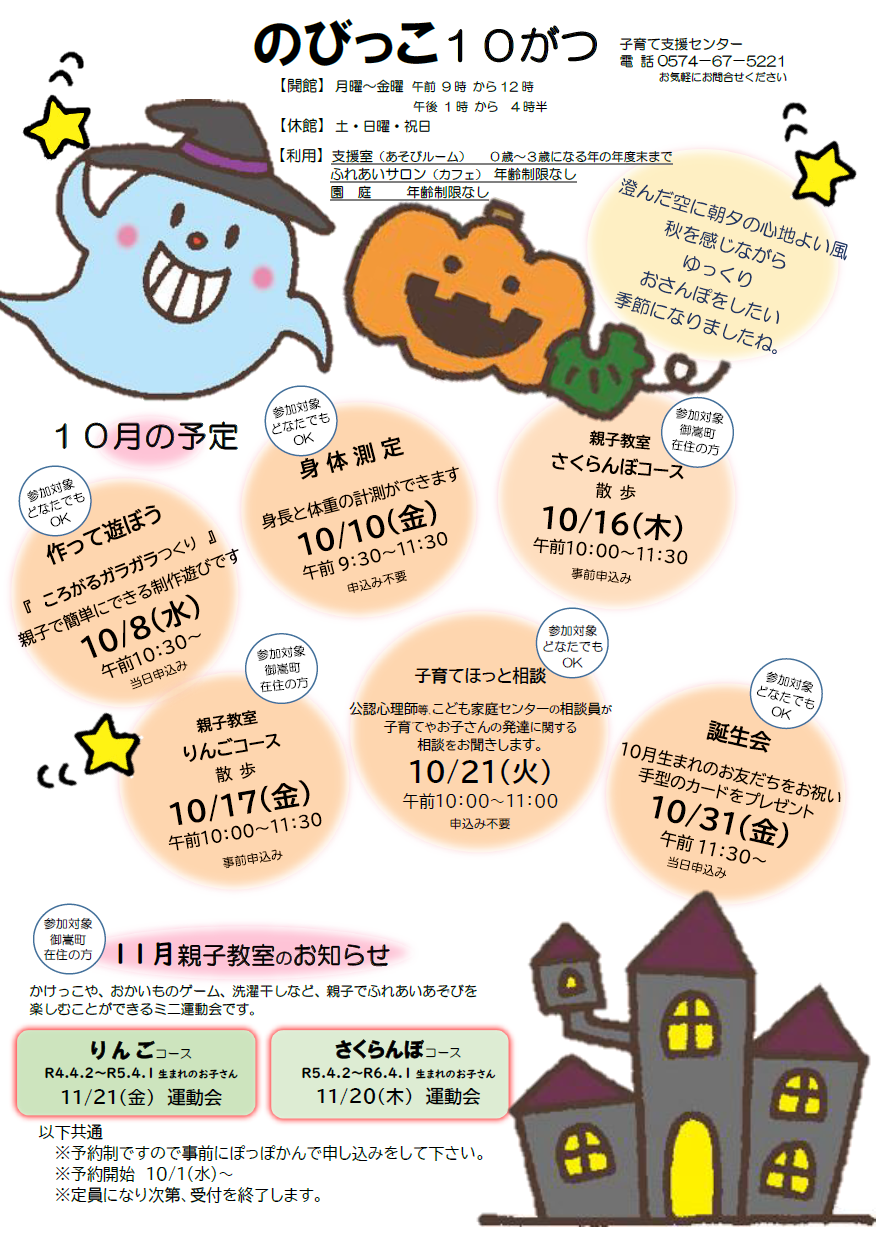 2025.10.01 ぽっぽかん10月のお知らせ こんにちは。ぽっぽかんです。暑さが和らいで気持ちの良い秋ですね。ぽっぽかんの園庭では、遊具あそびやバッタなどの虫探しを楽しむ姿が見られます。ぜひ遊びに来てください。 関連ファイル1(PNG:722KB) 一覧へ戻る