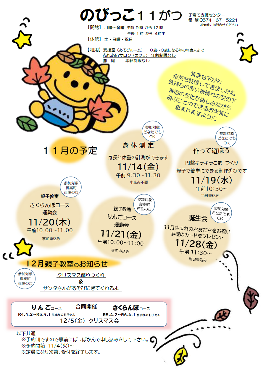 2025.11.05 ぽっぽかん11月のお知らせ こんにちは。ぽっぽかんです。秋が深まり、どんぐりやキレイな落ち葉など「自然の落とし物」がたくさん。子どもたちを楽しませてくれますね。ぽっぽかんにも自然の落とし物を探しに、遊びに来てください。 関連ファイル1(PNG:601KB) 一覧へ戻る