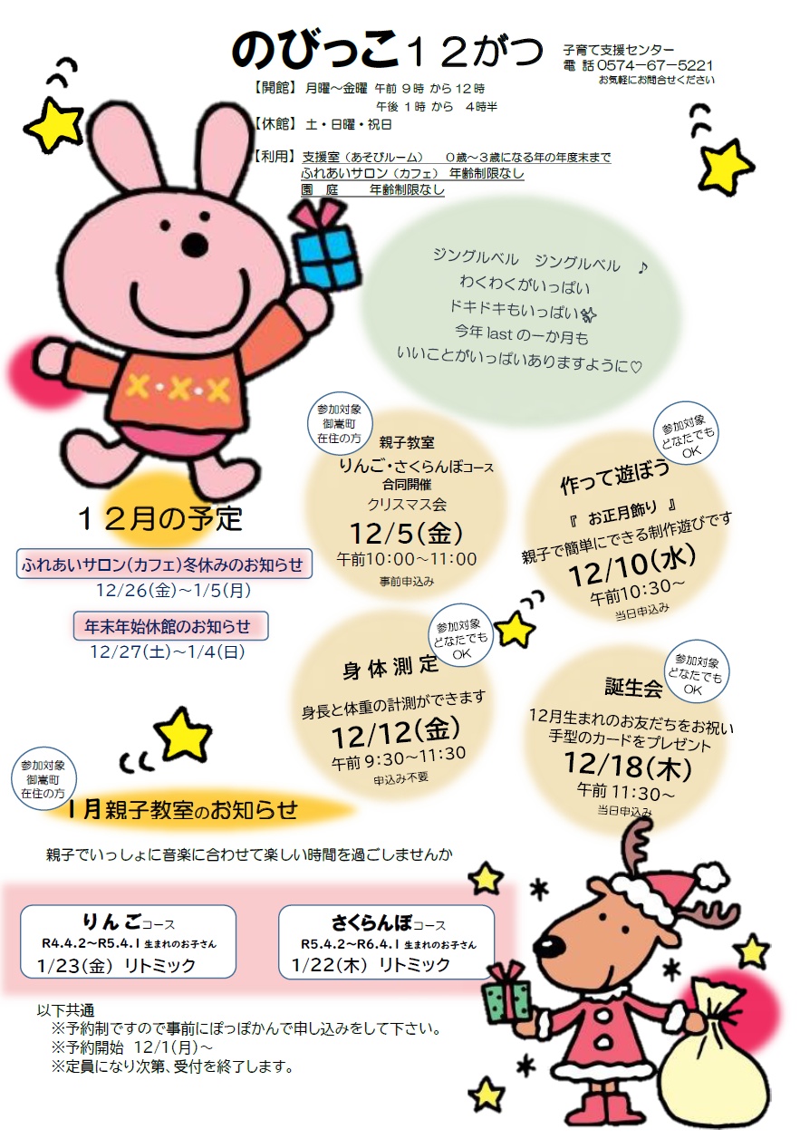 2025.12.01 ぽっぽかん12月のお知らせ こんにちは。ぽっぽかんです。12月に入り、クリスマスの季節になりましたね。ぽっぽかんでもクリスマスツリーを飾りました。ぜひ遊びに来てください。 関連ファイル1(PNG:681KB) 一覧へ戻る